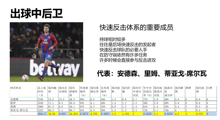 相对于拖后组织者,出球中后卫显得更加亮眼。这类球员代表了进攻体系的另一个版本,也就是快速反击。球队会刻意给予他们更多的球权,或者让他们带球向前后一脚横传找到中前场,或者一个大脚将球找到中前场寻求快速反击机会。安德森、里姆和弟媳在本赛季都承担了这样的任务。显然,这是一个非常适合中游球队打造自己“攻势足球”的方式,而波特突然将这套体系带到了理应稳居上游的切尔西,这也造成了切尔西的困境