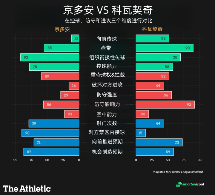 京多安和B席都能适应低位和高位的角色,无论是面对采用高位压迫的球队还是摆大巴的对手,二人都有用武之地,但科瓦契奇可能更适合靠后的位置。