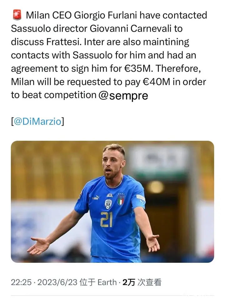 迪马:国米和萨索洛已经达成协议35M签弗拉泰西,...圣西罗卡卡_ @懂球帝2023-06-24 15:15迪马:国米和萨索洛已经达成协议35M签弗拉泰西,米兰被要求出40M 米兰CEO弗拉尼已联系萨索洛的卡尔内瓦利讨论弗拉泰西的事宜。 国际米兰还与萨索洛保持着联系,并已经达成一致以3500 万签下他。 因此,米兰将被要求支付 4000 万欧元以击败竞争对手。展开更多