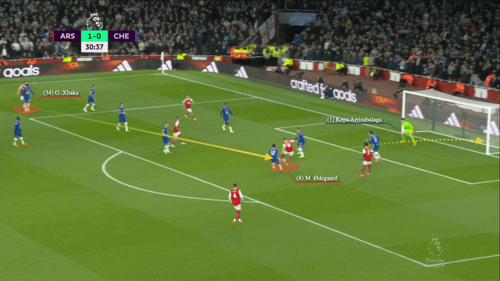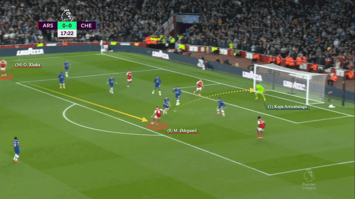 哈弗茨的无球跑动能力非常适合担任左边的8号位球员。近年来扎卡的进步主要建立在他进入禁区的方式上——瑞士人的跑动要么形成了直接的进攻威胁,要么为阿森纳的左边锋(通常是马丁内利)创造了更多的空间。