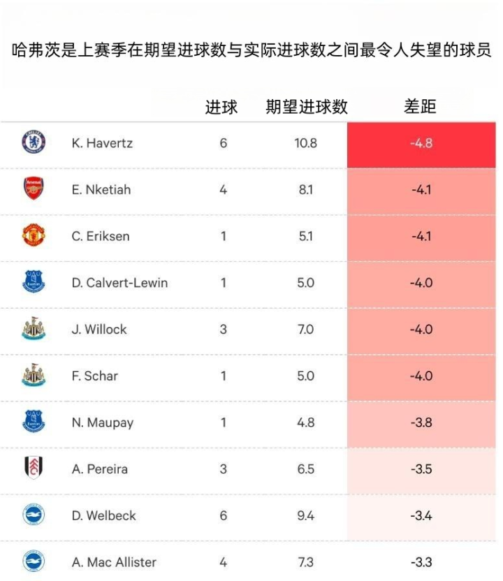 有时我们能感觉到哈弗茨身上背负了太大的压力,因为在大部分时间里他阿是切尔西的正印中锋和主要威胁点。2022-23赛季,哈弗茨是英超在期望进球数上表现最差的球员,但值得一提的是,在勒沃库森的最后两个赛季,他的实际进球数都超出了期望进球数。