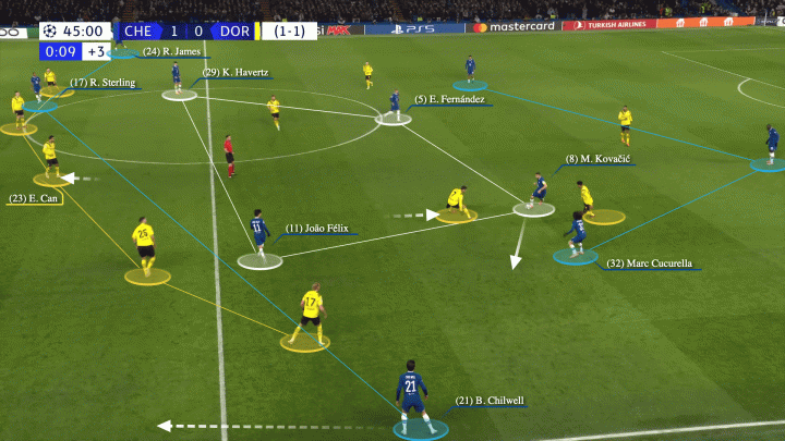 哈弗茨终于可以不用在最前方与对方大个中卫肉搏了,他在肋部会得到充分的空间。如果作为9号球员,他持球在脚的习惯是有问题的,因为这样无法有效拉扯对方防线,但对于一名8号位球员来说,这种能力就很重要了。因为哈弗茨有一点特质经常被忽略——他是上赛季蓝军阵中做出创造机会动作最多的球员(54次)。
