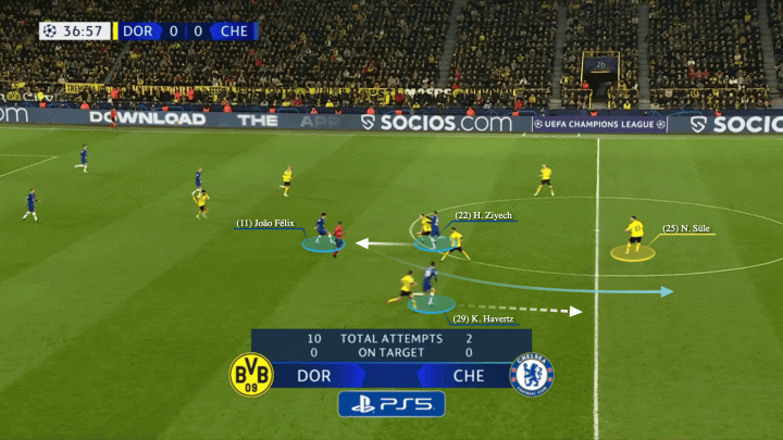 他上赛季发挥最好的一场是3月初欧冠首轮淘汰赛第二轮,对手是多特蒙德。在那场比赛里,切尔西采用了3-4-3阵型,哈弗茨隐藏在斯特林身后出任10号位。