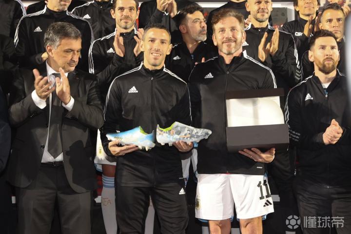南美足联主席Alejandro Domínguez参加马克西-罗德里格斯的告别赛,并向梅西赠送礼物,梅西则为他签名。