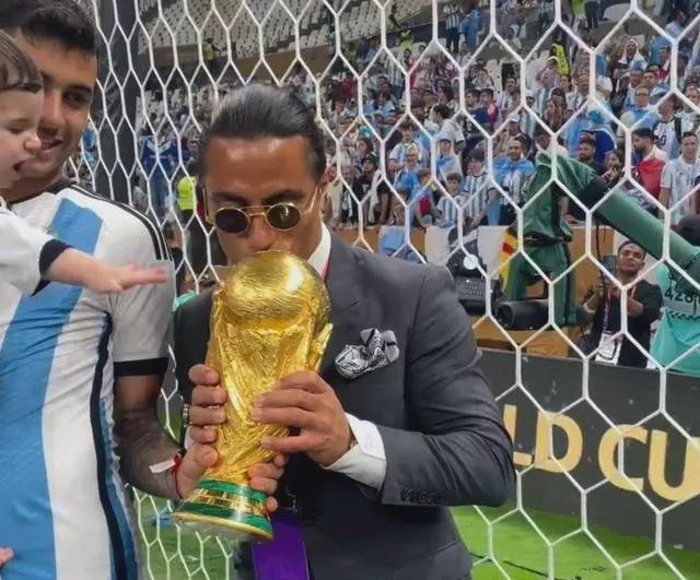 39岁的“撒盐哥”挽着着梅西自拍,咬了冠军奖牌,从阿根廷球员手中抢过标志性的金杯亲吻,还举过头顶,好像在庆祝自己赢得了世界杯。