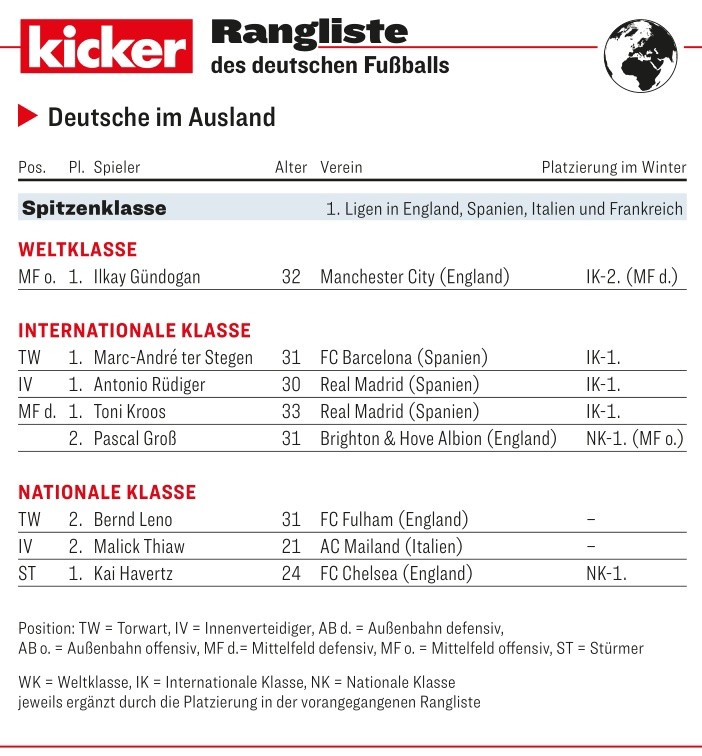 本周德国足球媒体《踢球者》杂志按照惯例评选出了德甲本赛季下半程各个位置的评级,在德国海外球员的评级中,曼城中场京多安获评世界级,京多安也成为2022-23赛季下半程德甲球员和德国海外球员范围内《踢球者》唯一评选为世界级的球员。特尔施特根、吕迪格、克罗斯和格罗斯获评洲际级。