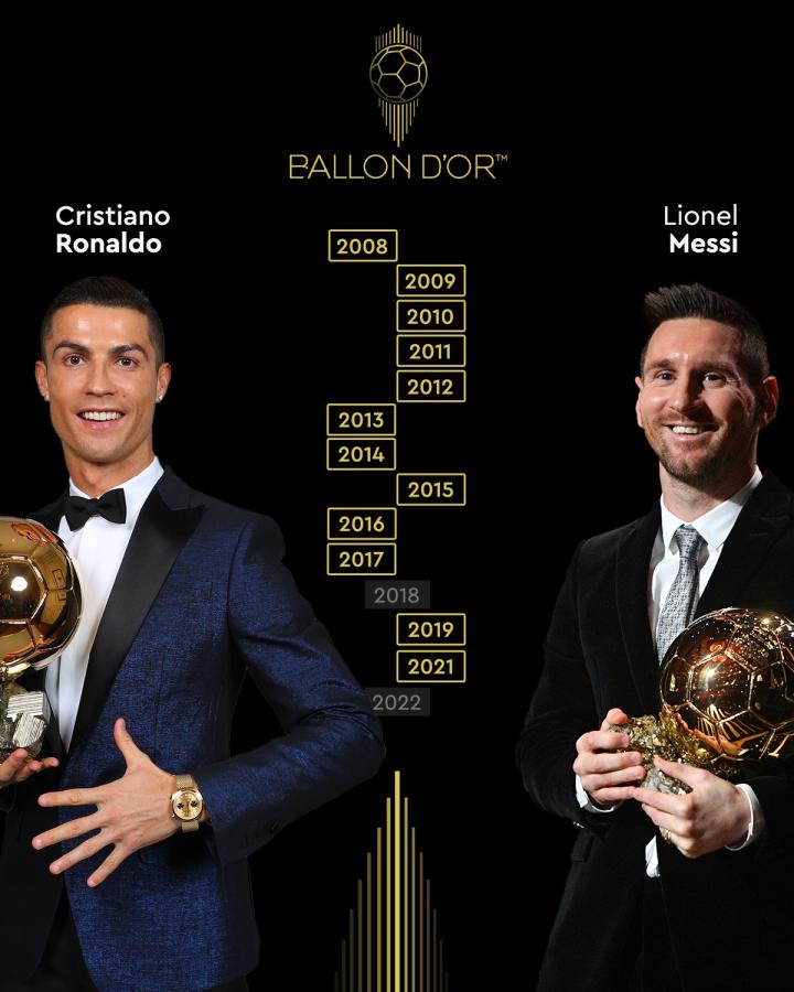 梅西曾于2009年、2010年、2011年、2012年、2015年、2019年和2021年七次夺得金球奖,而C罗则在2008年、2013年、2014年、2016年和2017年先后五夺金球奖。