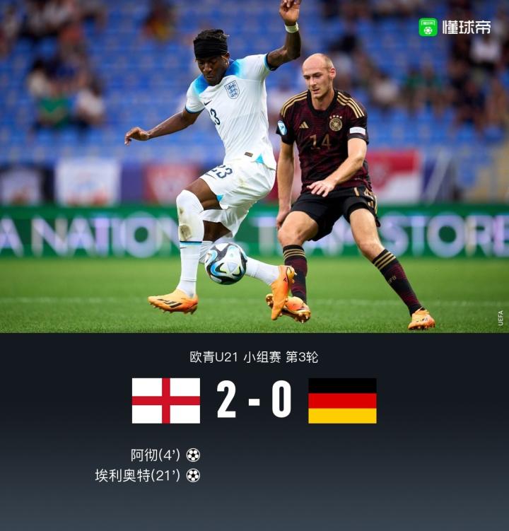 北京时间6月29日00:00,欧青赛小组赛C组第3轮在格鲁吉亚巴统竞技场展开角逐,英格兰U21对阵德国U21,本场主裁判为阿加耶夫。上半场,雅各布-拉姆齐精妙直塞助攻阿彻闪击,埃利奥特一条龙奔袭破门再下一城。下半场,埃利奥特怒射被扑。最终,U21英格兰2-0轻取德国U21,三战全胜以小组头名出线;德国U21则小组垫底出局。
