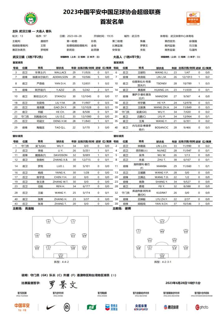 2023中国足球协会超级联赛第13轮,武汉三镇v...武汉三镇足球俱乐部 @懂球帝2023-06-28 18:352023中国足球协会超级联赛第13轮,武汉三镇vs大连人 6月28日19:35,武汉体育中心体育场 武汉三镇队首发及替补球员名单:展开更多