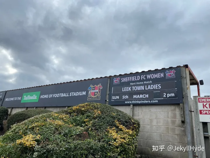 再往前走一点,终于可以看到谢菲尔德足球俱乐部的主场足球之家体育场的外部装饰,标注的是谢菲尔德足球俱乐部女足队的比赛时间。