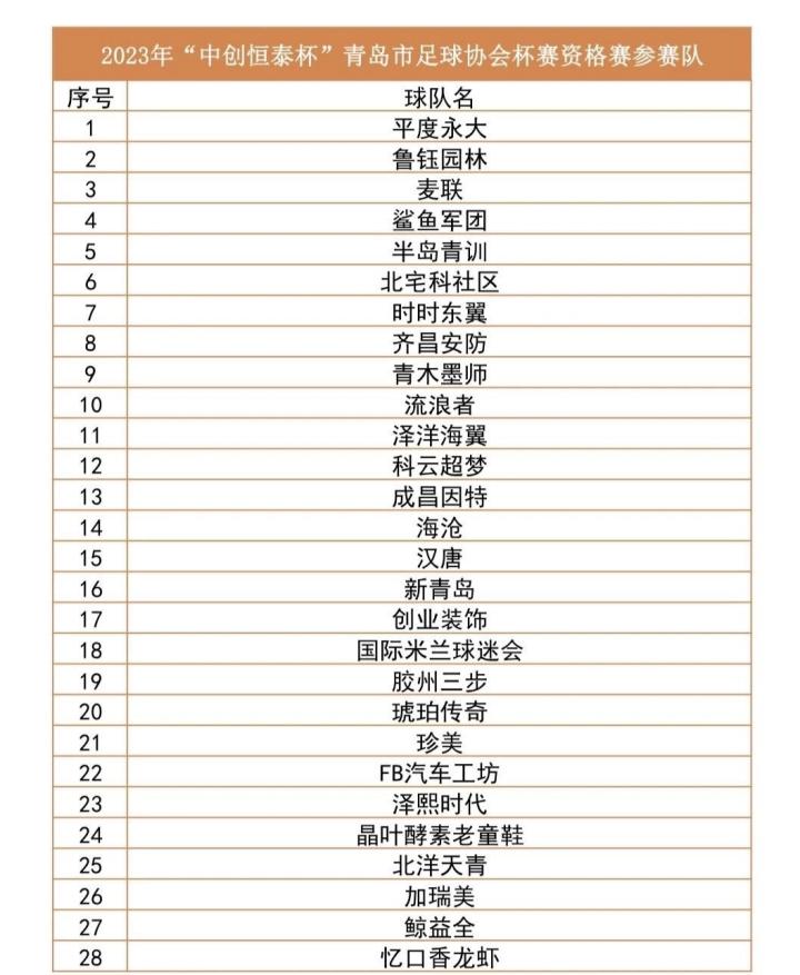 2023年“中创恒泰杯”青岛市足球协会杯赛共有46支球队报名参赛。本次赛事赛制为资格赛阶段加正赛阶段,资格赛参赛球队为28支,通过单场定胜负的方式决出14支球队晋级正赛阶段。正赛阶段赛事规模为32支球队,分成8个小组,每个小组的前两名出线,通过单场淘汰赛的方式决出前8名。