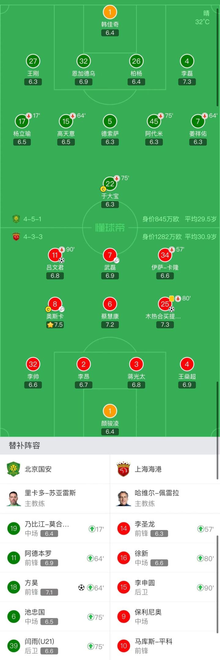 北京国安首发:1-韩佳奇、26-柏杨、27-王刚、32-恩加德乌、4-李磊、7-姜祥佑(64'11-阿德本罗)、45-阿代米(75'39-闫雨)、5-德索萨、15-高天意(64'18-方昊)、17-杨立瑜(17'19-乃比江)、22-于大宝(75'6-池忠国)