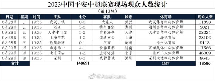 中超第13轮现场观众:国安vs海港46309人最多,场均18586人ETChalmers @懂球帝2023-06-29 22:19中超第13轮8场比赛全部战罢,本轮现场观众人数统计出炉,国安vs海港46309人最多,场均18586人。中超第13轮现场观众人数武汉三镇vs大连人 11893人浙江vs梅州客家 5021人天津津门虎vs青岛海牛 22024人上海申花vs南通支云 28102人沧州雄狮vs河南 9113人山东泰山vs长春亚泰 17586人北京国安vs上海海港 46309人深圳vs成都蓉城 8643人数据来源:@Asaikana 展开更多