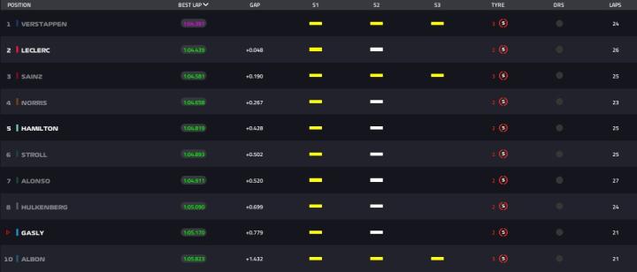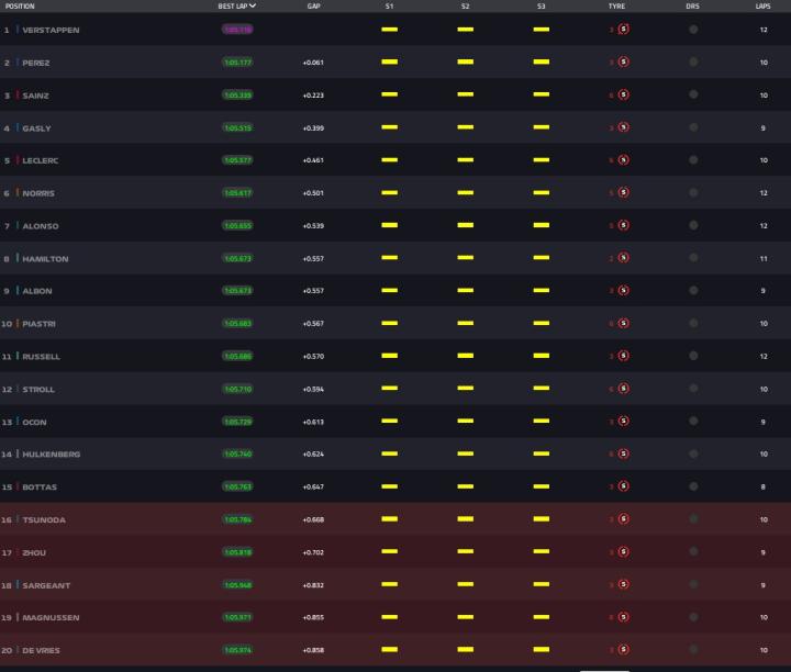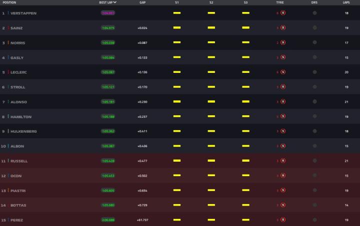 维斯塔潘重新做了成绩,成绩为1分04秒951,重新回到第一。塞恩斯以1分05秒036的成绩排在第2。