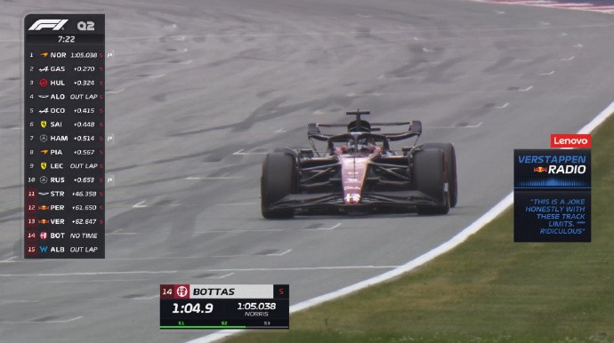 佩雷兹顶住压力,做出1分04秒990的成绩,来到第2位。结果最后成绩又被取消了……拉塞尔最终也没能做出更好的成绩。加斯利、阿尔本以及霍肯博格的成绩也被取消,但这并不妨碍他们进入Q3。不过霍肯博格的问题出现在了6号弯,还蛮与众不同的……