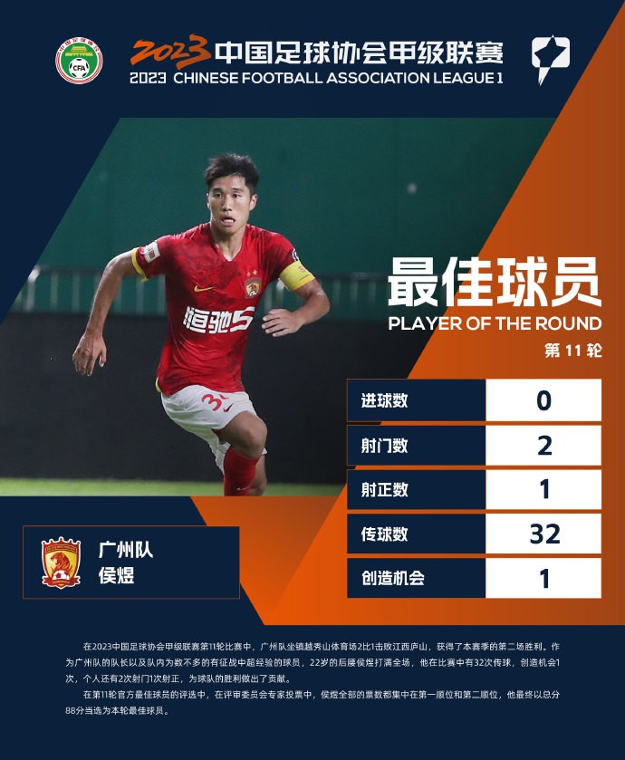 第11轮最佳球员丨在2023中国足球协会甲级联赛第11轮比赛中,广州队坐镇越秀山体育场2比1击败江西庐山,获得了本赛季的第二场胜利。作为广州足球俱乐部的队长以及队内为数不多的有征战中超经验的球员,22岁的后腰侯煜打满全场,他在比赛中有32次传球,创造机会1次,个人还有2次射门1次射正,为球队的胜利做出了贡献。