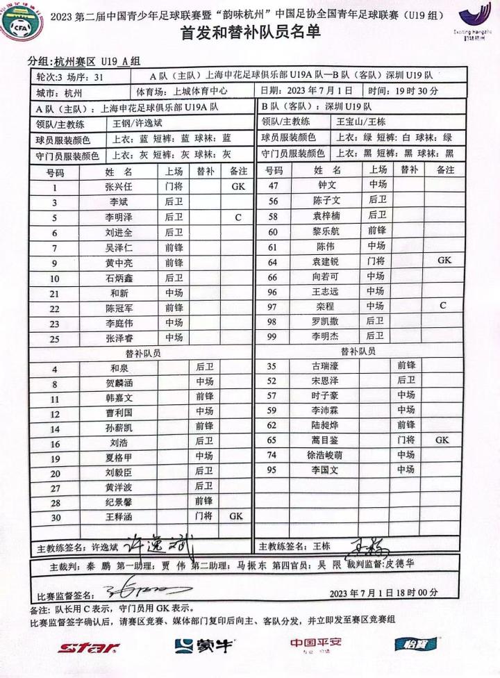 申花青训·中青联(U19)| 上海申花U19 A队0-2深圳U19队 北京时间7月1日19:30,2023年第二届中国青少年足球联赛暨“韵味杭州”中国足协全国青年足球联赛(U19组)第二阶段A组第三轮,由许逸斌指导率领的上海申花U19 A队对阵深圳U19队的比赛在杭州上城体育中心进行。 上半场第17分钟,深圳队率先破门一球领先。第33分钟,深圳队通过点球机会扩大领先优势。易边再战后第52分钟,申花左路传中,韩嘉文跟进推射,被对方后卫门线解围。第72分钟,申花定位球开入禁区,石炳鑫头球擦柱而出。 全场战罢,上海申花U19 A队0-2深圳U19队。7月3日19:30,上海申花U19 A队将在杭州上城体育中心迎战上海海港U19队。