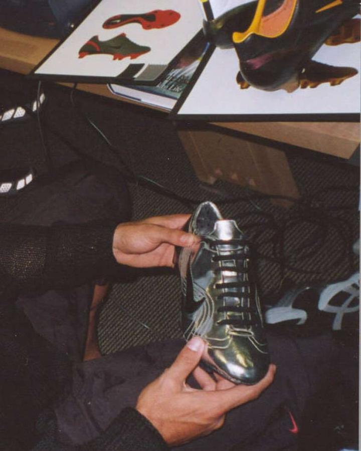 足坛最经典的球鞋,非罗纳尔多在98年世界杯上穿的球鞋--银蓝水星莫属。这款球鞋开启了足球鞋的一个全新时代,关于这款球鞋的背后,其实还有很多的故事。 1996年,著名运动品牌商耐克公司开始与世界上最成功的球队巴西国家队建立了合作关系。然后,创造一支与这个团队口径相符的球鞋的任务在那时就出现了。而罗纳尔多,正是当时球队的头号前锋,于是天然的就被选为这款球鞋的灵感来源。 为了打造适合罗纳尔多超级爆发力风格的球鞋,耐克公司的设计师们关注了品牌的历史。第一个概念始于解构的运动鞋,混合了耐克天宝系列的鞋面。为了迎接减少重量的这一挑战,设计团队摆脱了长期以来占主导地位的设计,他们放弃了袋鼠皮革,决定使用合成材料-KNG-100予以替代。 球鞋的第二个大革命就是鞋板厚度的减少,从标准的3毫米减至仅1.75毫米。这标志着足球球鞋历史上的一个转折点。 回到那时,一切看起来很可怕,无论是外观,还是使用的材料都引起了巨大的轰动。