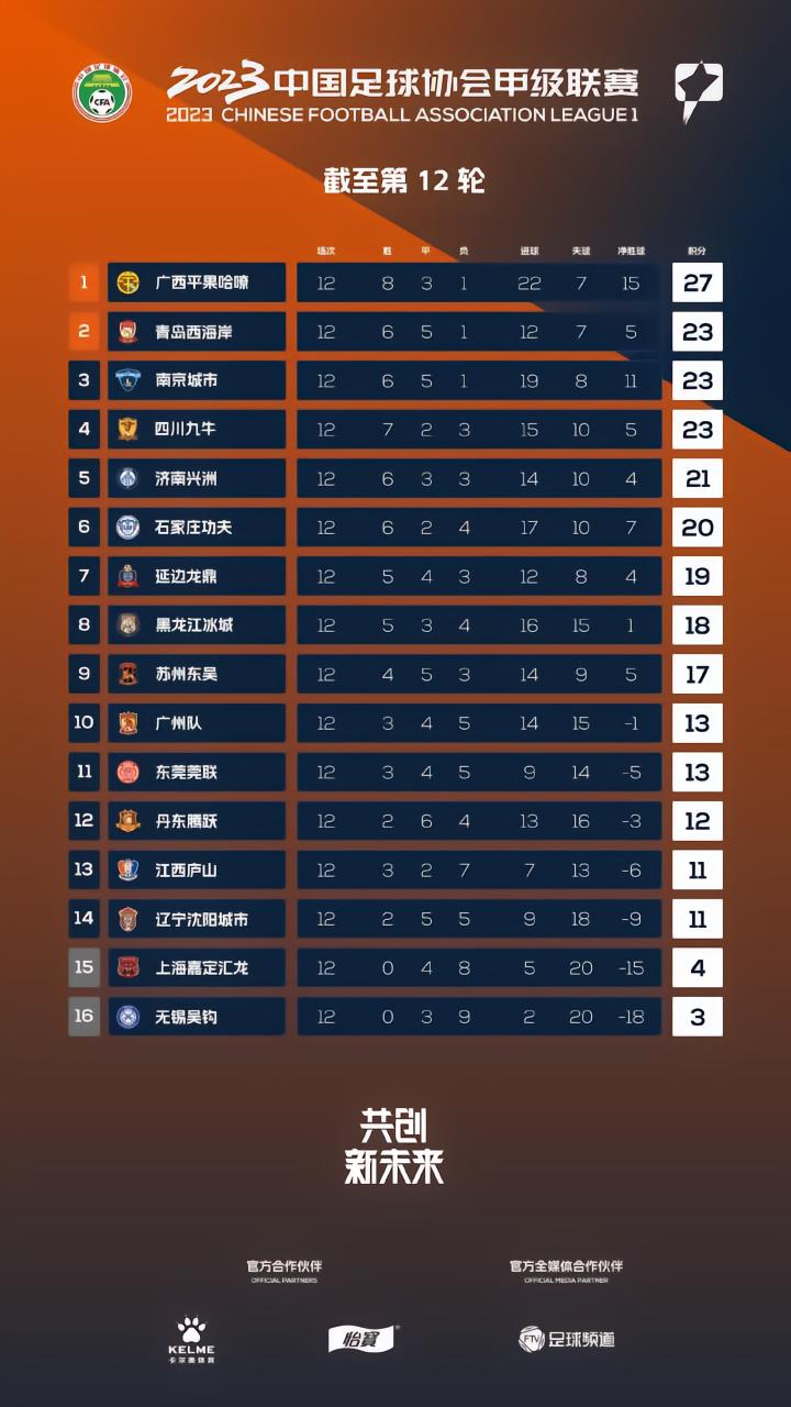 广西平果哈嘹1-2东莞莞联,积27分继续领跑中甲积分榜,射手榜方面,安永佳9球独自领跑,刘柏杨6球排名第4,孙伟哲以4个助攻排名助攻榜第2名。