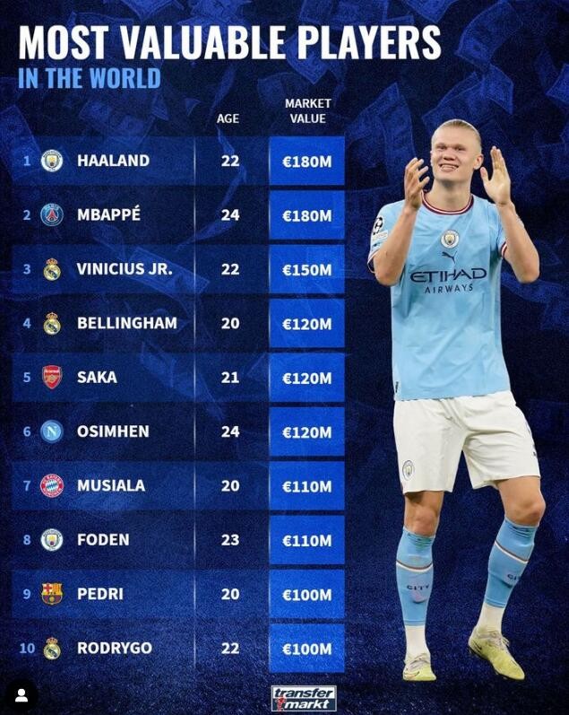 最近德国知名足球数据网站“转会市场”更新了足坛球员的最新身价,“转会市场”根据最新的球员身价,列出了目前足坛身价评估最高的10名球员。曼城中锋哈兰德、巴黎圣日耳曼球星姆巴佩以及皇家马德里年轻攻击手维尼修斯排名前三。