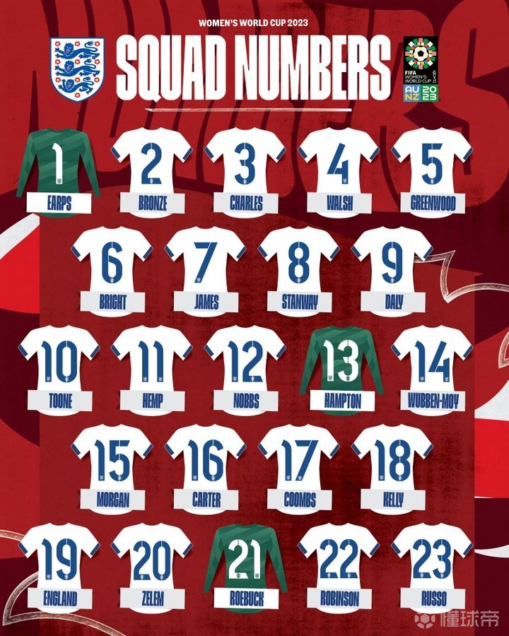 英格兰女足世界杯球衣号码:布龙泽2号,图恩10号,詹姆斯7号