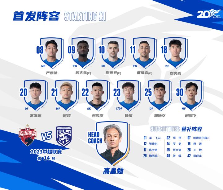 8-严鼎皓(66′ 12-张晓彬)、9-阿齐兹(66′ 7-埃德米尔森)、10-斯坦丘(74′ 29-陶强龙)、11-戴维森、18-刘奕鸣(85′ 19-张文涛)、20-高准翼(74′ 28-王毅)、21-何超、22-刘殿座、23-任航、25-邓涵文、30-谢鹏飞