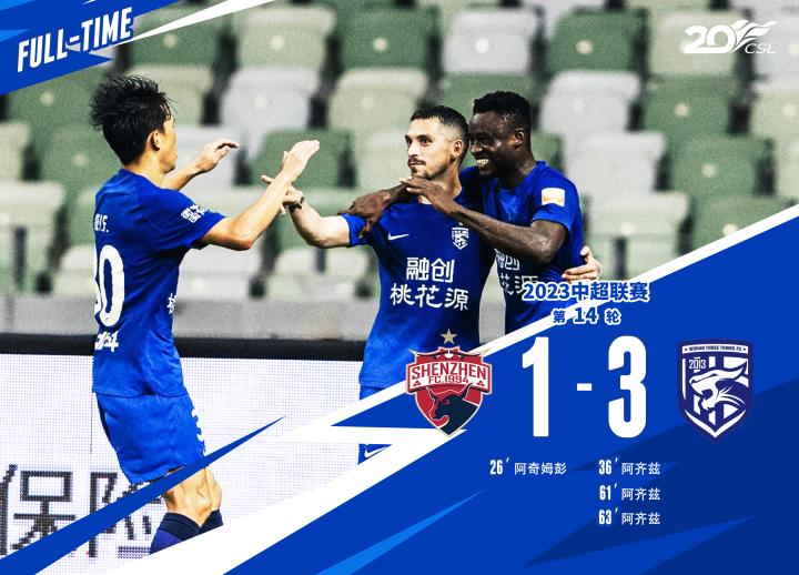 北京时间7月3日19:35,2023中国足球协会超级联赛第14轮,武汉三镇队作客深圳宝安体育中心体育场对阵深圳队。上半场比赛,阿奇姆彭的进球帮助深圳队取得领先,随后阿齐兹扳平比分。易边再战,阿齐兹在第61-63分钟连入两球,上演个人中超首个帽子戏法,同时也帮助三镇队将比分逆转。最终,武汉三镇客场3-1战胜深圳队。