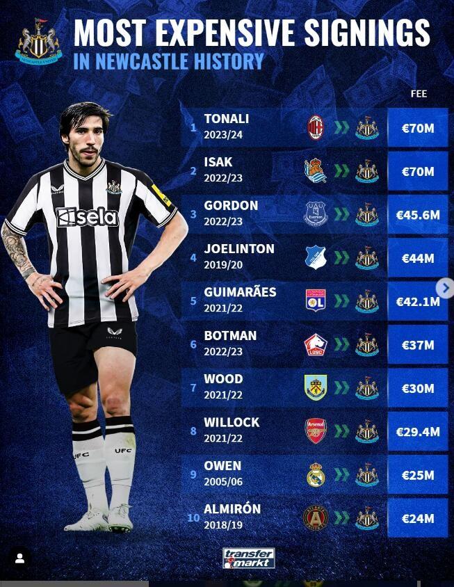 北京时间昨晚,英超纽卡斯尔联俱乐部正式宣布签下AC米兰的意大利球员托纳利。之前多家媒体的消息称,托纳利的转会费是7000万欧元。德国知名足球数据网站“转会市场”列出了纽卡斯尔联队史的引援转会纪录,托纳利和伊萨克并列7000万欧。