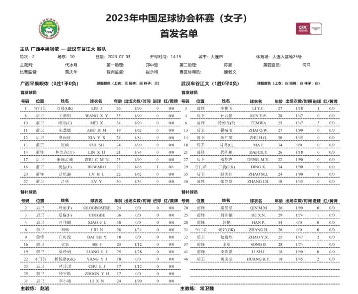 7月3日14:30,大连人基地25号场,女子足协杯小组赛第二轮,广西平果呗侬女足对阵女超“班霸”武汉车谷江大女足,平果呗侬依旧排出5-2-3阵型,首发名单相较于上一场,仅有一处调整,吕秧替换李小楠首发出战。锋线上奥拉居中,林欣卉,吕杭潞位于两侧,中场吕秧,崔硕,边翼卫夏雨欣,朱陈孟楠,三中卫队长梅雪,王新阳,朱慧敏,首发门将刘瑾。