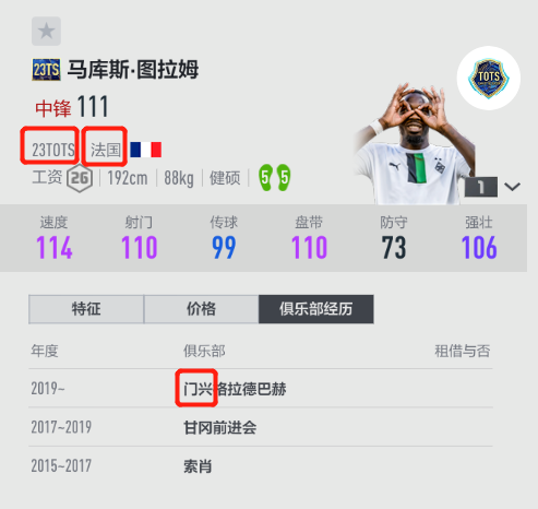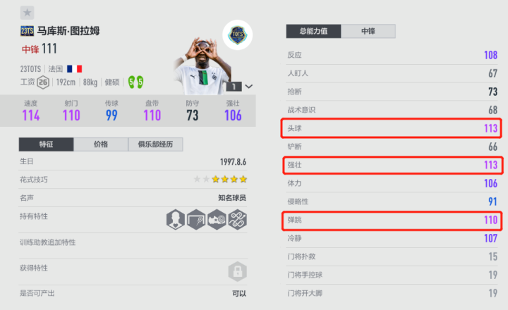 面板属性上,23TS图拉姆能力值初始只有111,但是小数据十分“炸裂”: 双速初始高达114、115,堪比姆巴佩等速度型前锋。