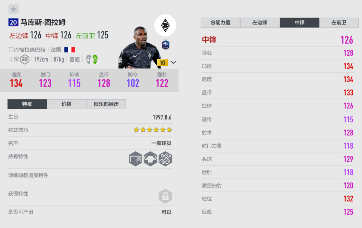 高射门力量,使得图拉姆射出的球更有速度,门将难以扑救。图拉姆虽然没有“善于头球”特性,不过射术和弹跳属性都很好,接传中头球应该也很擅长。