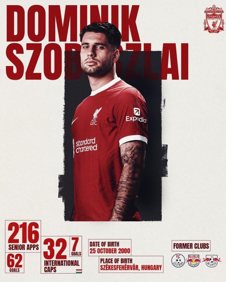 周六早上,索博斯洛伊飞往利物浦接受体检,周日,他在向导的带领下参观了安菲尔德和柯克比的AXA训练中心。他选择了杰拉德之前穿过的标志性8号球衣。