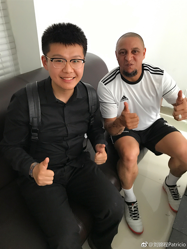 刘锦程(左)与巴西足球名宿罗伯特·卡洛斯(右)合影。供图/刘锦程