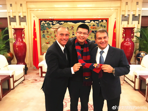 刘锦程(中)与巴萨俱乐部主席拉波尔塔(右)、副主席尤斯特(左)合影。供图/刘锦程