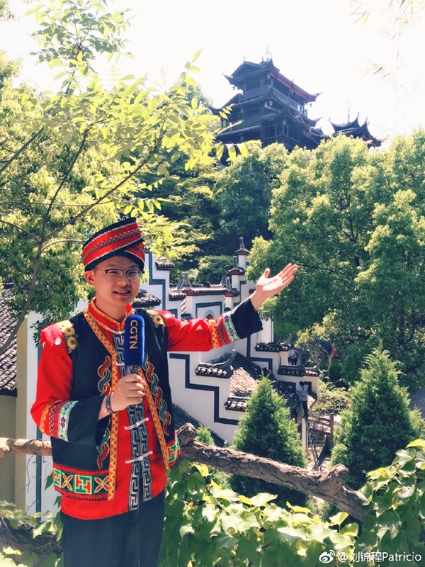 通过CGTN的镜头,身着土家族传统服饰的刘锦程,向全世界介绍自己的家乡张家界。供图/供图/刘锦程