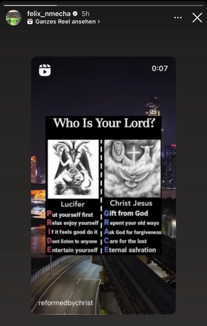 菲利克斯·恩梅查本可以让自己的职业生涯免遭这些风波影响,他可以像其他一些球员那样,将信仰观念默默放在心上。但他想公开,他想让每个人都走他走过的路——因为对他而言,这是唯一真实的道路。“我宁愿出于爱与别人分享一些东西,也许因此会受批评或者其他什么,也不想什么都不分享。”尽管他与德国足协、沃尔夫斯堡、多特蒙德所共有的价值观有所不同,但他认为“他们关注的价值观是尊重、爱和帮助。我不会说这与基督教相悖。”不过,这是在第二次风波前的四月所说的话。
