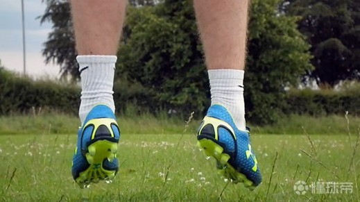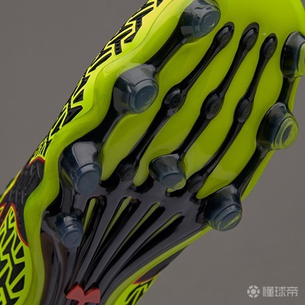 第一代ClutchFit Force的大底,也相对之前UA闷骚的足球鞋款式,有了较大幅度的改变,变得更具实用性。图中全新设计的骨纹大底是依据人体工程学的原理所设计,从外观上可以轻易得看出,条状固定物从前掌一直蔓延到后跟,还根据脚掌着力点以及蹬地发力时的力量传递来布置鞋钉和加强脊,外观上十分震撼。这样的设计不仅使得大底的韧性堪称当时最佳,没有之一,可以轻易弯曲,其鞋钉的设计也是采用了较为粗壮的圆钉,鞋钉长度都在1厘米左右,抓地和变相俱佳。ClutchFit Force 1.0的大底在人草上的兼容性,由于其出色的韧性和延展性,在一般人草上也不会出现断钉的情况,只是实际使用起来还是要根据自己的场地而量力而行。