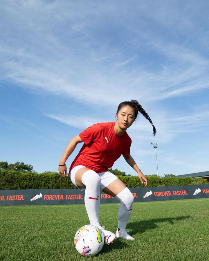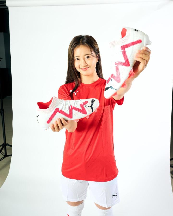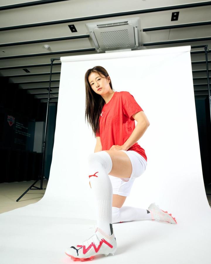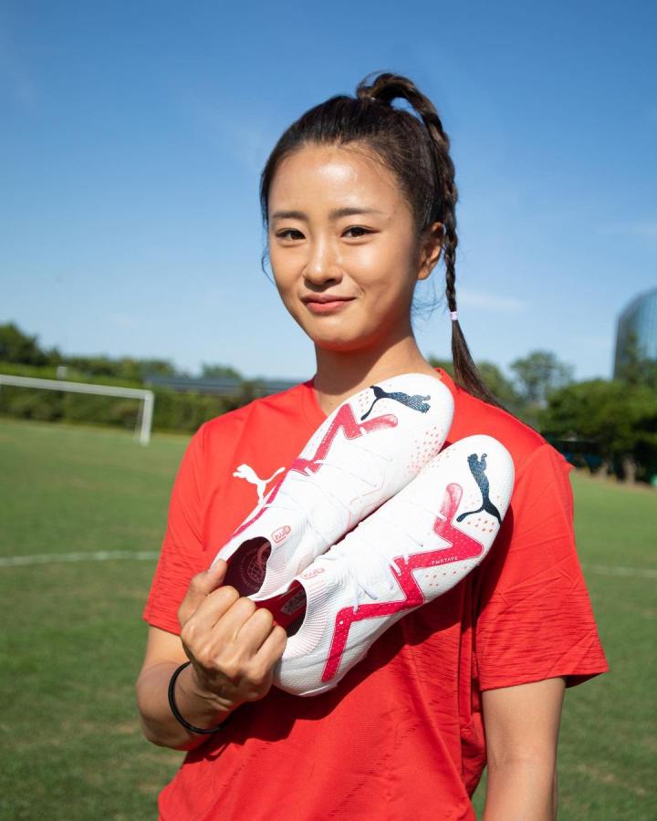 韩国女足国脚崔宥莉展示她的新球靴,她会穿着这款球...