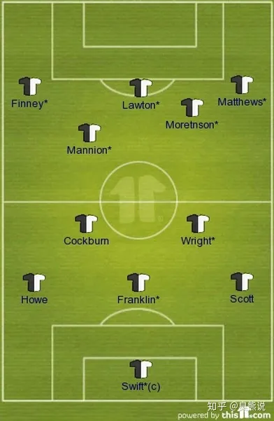 点评:40年代,足球鼻祖英格兰涌现了一批世界级的天才球星。后防线上,他们拥有狼队的传球队长比例·怀特,锋线上的劳顿和莫滕森是那个时代全欧洲最好的射手;首届金球先生马修斯爵士和汤姆·芬尼组成了全世界最强的双边锋。这只英格兰队有他们傲慢的资本,他们在都灵4:0战胜了名帅波佐领衔的意大利国家队,在那只意大利队中有7名球员来自那只伟大的都灵队;他们在里斯本以不可思议的10:0羞辱了葡萄牙人;同时,在他们的足球圣地,温布利大球场,英格兰人从未品尝过失利的滋味。在战术上,40年代的英格兰继续采用阿森纳名帅查普曼发明的W-M阵型并以此为傲。但随着时代的进步,英格兰也为他们的固守和傲慢付出了代价,他们在50年世界杯中0:1负于美国队;在1953年的“世纪之战”中,英格兰被另一只伟大的球队匈牙利6:3摧毁,这彻底宣告了英格兰足球黄金时代的结束。