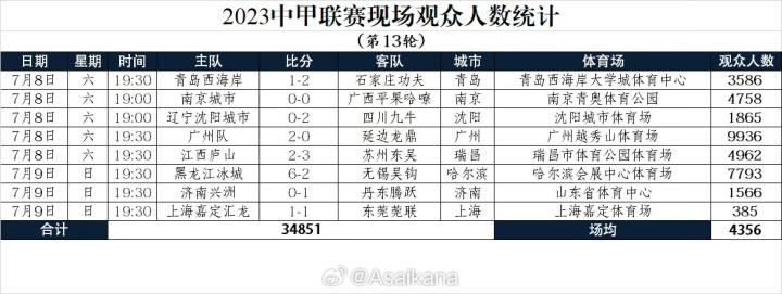中甲第13轮观众数:广州越秀山9936人居首,嘉定汇龙仅385人盖坦92023-07-09 23:53中甲第13轮的比赛全部结束,观众人数方面广州主场9936人居首,嘉定汇龙主场仅385人,平均观众人数为4356人。中甲第13轮观众人数数据统计:@Asaikana青岛西海岸vs石家庄功夫:3586人南京城市vs广西平果哈嘹:4758人辽宁沈阳城市vs四川九牛:1865人广州队vs延边龙鼎:9936人江西庐山vs苏州东吴:4962人黑龙江冰城vs无锡吴钩:7793人济南兴洲vs丹东腾跃:1566人上海嘉定汇龙vs东莞莞联:385人展开更多