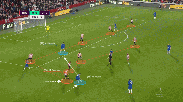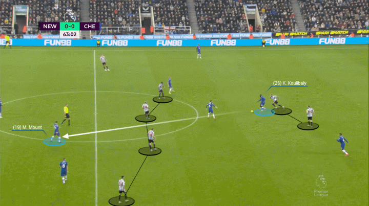 下图是对阵纽卡斯尔联时的例子,芒特一再回头观察自己周边的情况,然后移动到了一个可以接球的位置,成功接球后的芒特随即转身,找到了处于更前方的哈弗茨。