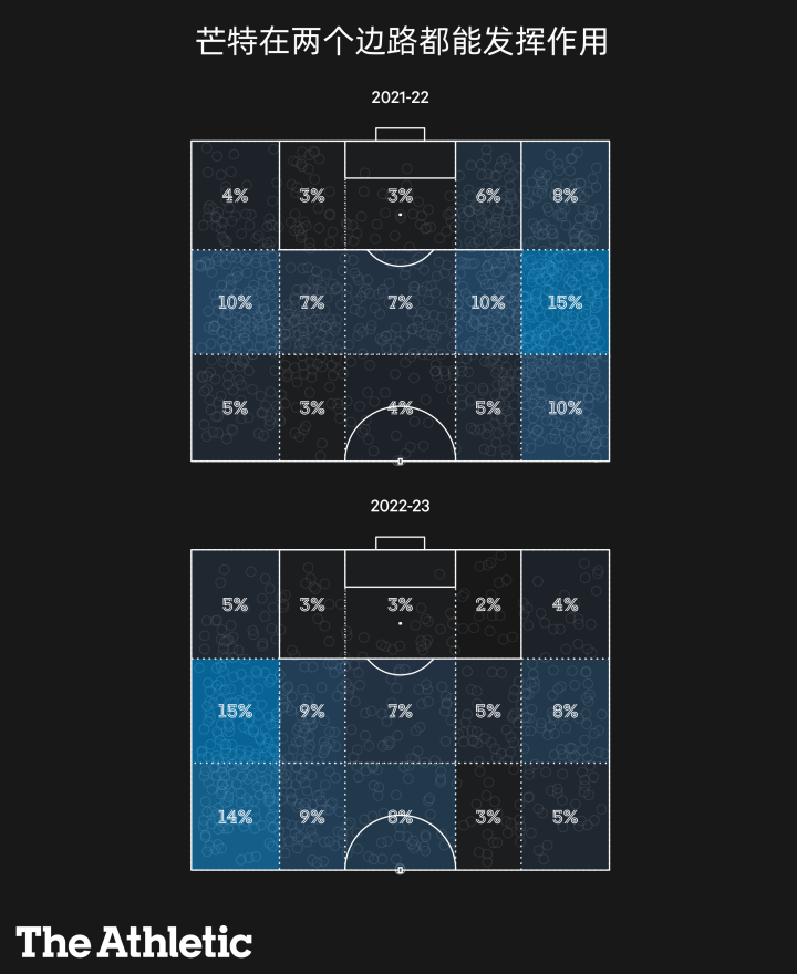 但是去年他被挪到了左路,他的位置更深,主要职责由直接冲击球门变成了推进。一般来说,位置回撤会影响到进攻的效果,但他在左路覆盖了几乎整个进攻半场,表明他无论是在高位和是低位都能舒服地传控。