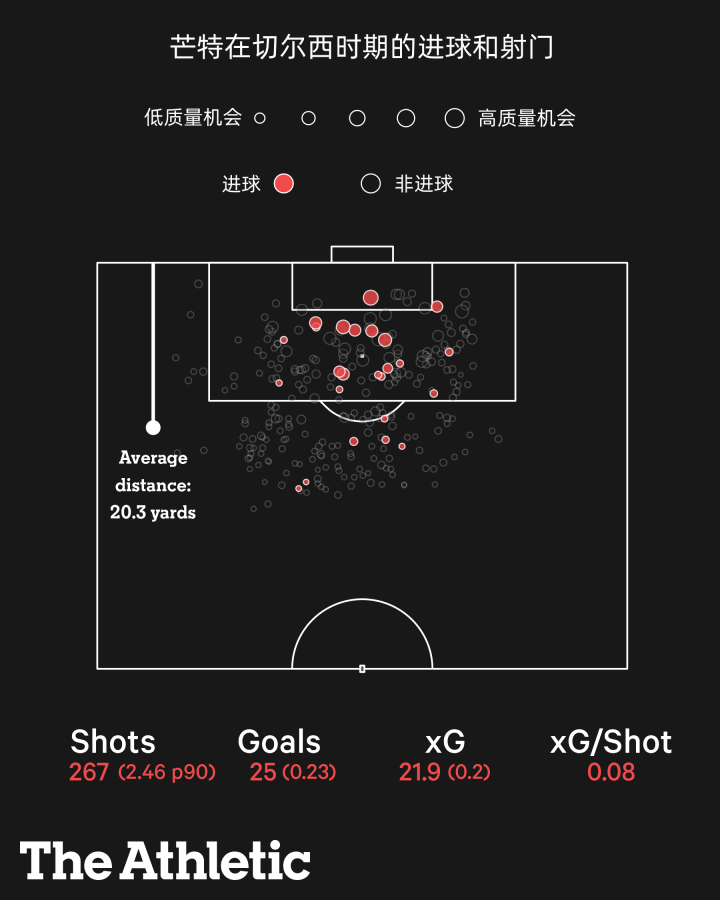 纵观芒特四年的英超生涯,他的总英超进球数排在队内榜首,领先第二名6个球,而且也是队内助攻王,领先第二名7次助攻。他场均有2.5次射门,喜欢后插上攻门,而且远射能力也在线。