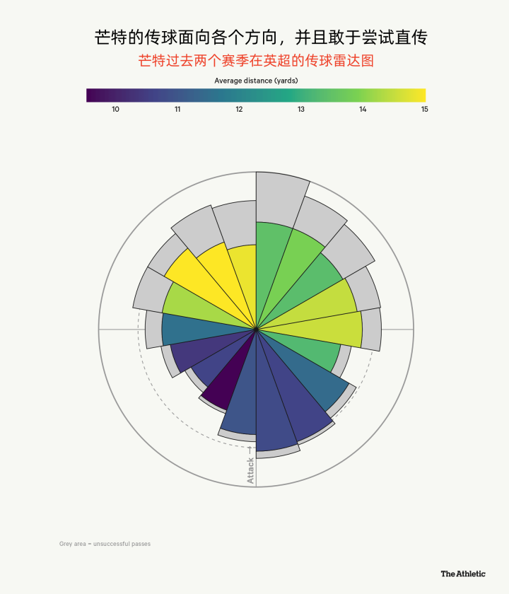 传球雷达图显示,芒特是一名积极向前的传球者,他2022-23赛季向前传球的成功率为64.6%。