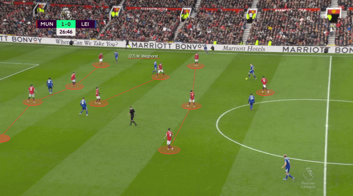 最极端的例子是,滕哈格在客场2-2逼平巴萨的比赛中,在偏左8号位上启用了中锋出身的韦格霍斯特,在对阵利兹联的比赛中曼联主帅故技重施,如下图所示。