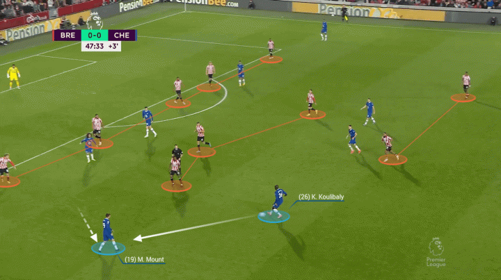 下图是对阵布伦特福德的例子,芒特选择回撤,接应库利巴利的传球。