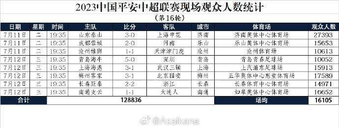 中超第16轮观众上座人数:场均1万6千人,鲁沪之战超2万7千人德鲁飞鱼 @懂球帝2023-07-12 23:12北京时间7月12日,中超联赛第16轮全面战罢,本轮观众最多的一场比赛是山东泰山主场迎战上海申花,观众人数达到27393人。图源德转中国区管理员朱艺@Asaikana各场次详细观众人数:山东泰山3-0上海申花,27393人成都蓉城2-0河南,15653人沧州雄狮1-1天津津门虎,10613人青岛海牛5-0深圳,10052人上海海港3-1武汉三镇,15913人梅州客家3-1北京国安,17589人长春亚泰2-2浙江,14971人南通支云1-1大连人,16652人展开更多