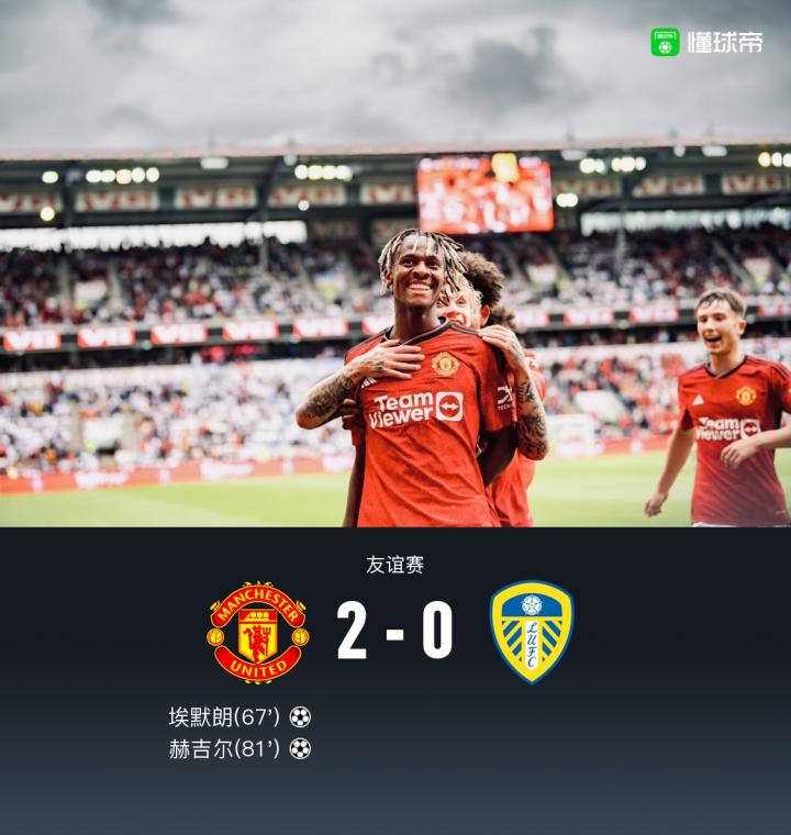 北京时间7月12日23:00,友谊赛曼联在挪威奥斯陆的乌勒瓦尔球场对阵利兹联。上半场,汉尼拔推射被门将扑出,芒特吊射打高,A-费尔南德斯头球顶偏。下半场,斯特鲁伊克头球攻门顶偏,埃默朗、赫吉尔替补建功,最终,曼联2-0利兹联。