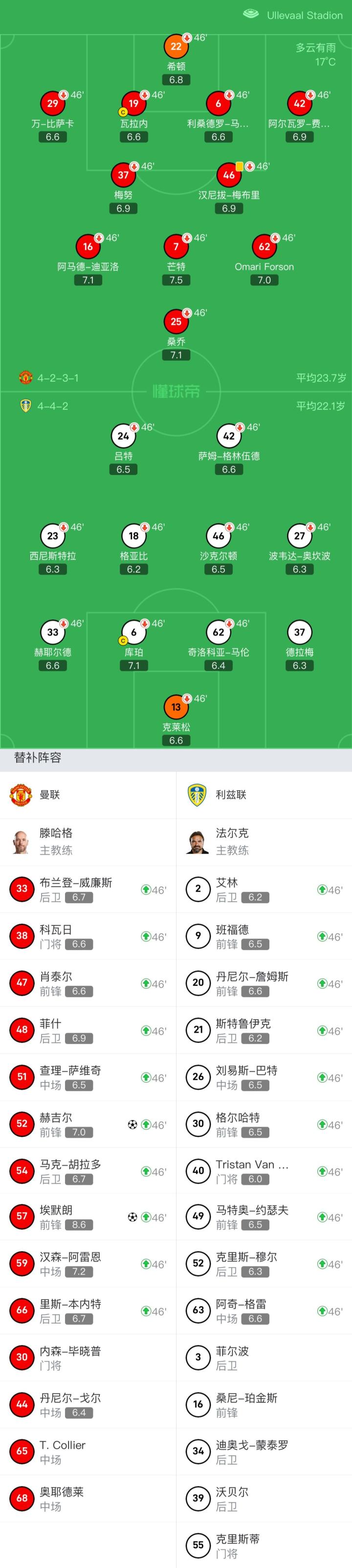 利兹联首发:13-克莱松、33-赫耶尔德、37-德拉梅、6-库珀、62-奇洛科亚-马伦、18-格亚比、46-沙克尔顿、42-萨姆-格林伍德、27-波韦达-奥坎波、23-西尼斯特拉、24-吕特