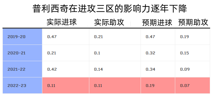 这反映在过去两年普利希奇在预期和实际进球/助攻上的明显下滑。